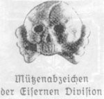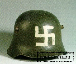 Вероятнее всего, именно из Прибалтики (а именно - из Латвии), но возможно, также из Финляндии сражавшиеся там против большевиков на стороне белых латышей и финнов германские добровольцы позаимствовали свастику (по-латышски: угунскрустс, т.е.: огненный крест; по-фински: гакаристи, т.е. крюковидный крест), являвшуюся с незапамятных времен деталью латышского и финского национального орнамента. Со времен боев в Финляндии и Прибалтики прямостоящая, солнечная или лунная, свастика-гакенкрейц (обычно белого цвета), нанесенная масляной краской (а иногда и прото мелом) стала опознавательным знаком на стальных касках, автомобилях и броневиках германских белых добровольческих отрядов, в том числе и не воевавших в Финляндии и Прибалтике (например, 2-й Вильгельмсгафенской военно-морской бригады Эргардта), хотя отдельные случаи использования свастики в качестве эмблемы (например, асами кайзеровской военной авиации) наблюдались и ранее, в период Великой (Первой мировой) войны. Не меньшей популярностью, чем свастика, пользовался среди фрайкоровцев и традиционный опознавательный знак отборных германских воинских частей - череп и кости (Тотенкопф, или, по-русски, буквально: Мертвая голова).