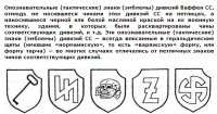 Почти все эти дивизии имели собственные эмблемы (тактические, или опознавательные, знаки), отнюдь не носимые чинами данных дивизий в качестве нарукавных нашивок (редкие исключения общую картину не меняли), а наносимые белой, чёрной или жёлтой масляной краской на дивизионную военную технику и автотранспорт; здания, в которых были расквартированы чины соответствующих дивизий; соответствующие указатели в расположениях частей; самолёты (если они имелись) и т.д. Эти опознавательные (тактические) знаки, или эмблемы ("эркеннунгсцейхен", нем.: Erkennungszeichen) дивизий СС – почти всегда вписанные в геральдические щиты (имевшие "варяжскую", или "норманнскую", форму или форму тарча) /1/- во многих случаях отличались от петличных знаков чинов соответствующих дивизий.