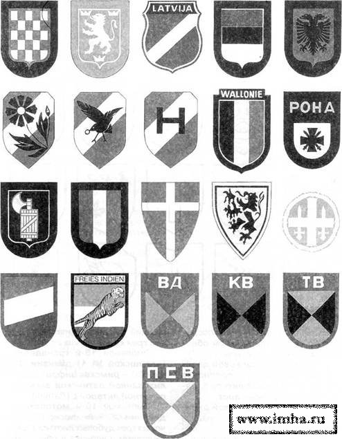 Все нарукавные нашивки соединений и частей Ваффен СС, которые приводятся ниже, имели форму геральдических щитов различной конфигурации (реже - прямоугольников формы национального флага), нашиваемых на левый рукав мундира выше или ниже локтевого сгиба (в разных частях по-разному). Многие из них (но не все) первоначально являлись опознавательными знаками иностранных добровольцев, сражавшихся на стороне Третьего рейха в составе германского вермахта (Добровольческого корпуса "Дания", Валлонского легиона, Норвежского легиона, Французского антибольшевицкого добровольческого легиона, испанской Синей дивизии, британского Легиона Святого Георгия). Иностранные добровольцы германского вермахта носили свои нашивки на правом рукаве (а не на левом, как иностранные добровольцы в составе Ваффен СС).