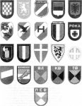 Нарукавная нашивка чинов 28-й добровольческой мотопехотной дивизии СС "Валлония" (ранее - "Валлонской штурмовой бригады" в составе 5-й танковой дивизии СС "Викинг") - "норманнский" ("варяжский") щит цветов бельгийского государственного флага (три вертикальные полосы - черная, желтая и красная) или, выражаясь геральдическим языком - варяжский щит, рассеченный в чернь, золото и червлень, с надписью заглавными серебряными латинскими литерами "WALLONIE (ВАЛЛОНИЯ)" в черной главе щита. Валлоны носили эту нашивку (имевшую иногда форм "польского" щитка-тарча) на левом плече выше локтевого сгиба, под эсэсовским орлом. Знамя у них было черное (в последующем - белое) с красным "суковатым" Бургундским Крестом и серебряной бахромой. Отдельные подразделения валлонов имели белые знамена с изображением руки в латах с занесенным прямым мечом на аверсе и красными Бургундскими Крестами и лентой с девизом на реверсе. Древки валлонских знамен имели навершия в форме наконечников средневековых копий, протазанов или алебард.