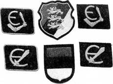 Чины 20-й гренадерской дивизии Ваффен СС (эстонской №1) - согнутую в локте руку в доспехах с мечом под литерой "Е», стилизованной под полумесяц (судя по сохранившимся плакатам военных времен, аналогичная эмблема - согнутая в локте рука с мечом и буква "Е» - изображалась и на касках эстонских добровольцев СС, хотя соответствующих фотографий автору видеть не пришлось).![]()