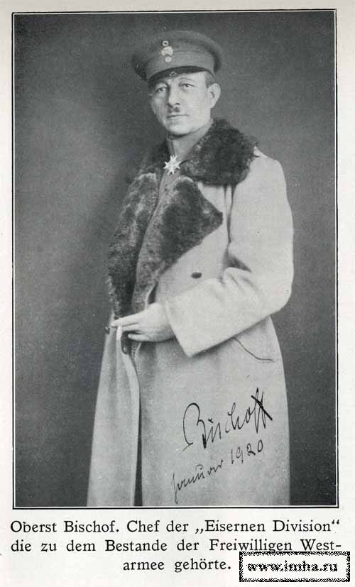 Совершенно новый поворот события приняли после назначения командиром Железной бригады германского майора Йозефа Бишофа. Начав службу в 166-м пехотном полку в г. Бич (Эльзас), он затем 8 лет прослужил офицером в Имперских охранных (то есть колониальных) войсках, первоначально в Германской Восточной, а позднее – в Юго-Западной Африке (нынешней Намибии).В 1917 году Бишоф, будучи командиром 461-го пехотного полка, награждается высшим военным орденом "За заслуги" (нем.: Pour le Merite) за успешное форсирование реки Серет. И, наконец, 16 января 1919 года германское командование поручило ему возглавить добровольческие части на Курляндском фронте. Его начальник, назначенный командующим VI (резервной) германской армией (VI резервным Корпусом) в Прибалтике генерал-майор граф Рюдигер фон дер Гольц, характеризовал майора Бишофа следующим образом: "Познакомившись с ним, я не раз задавался вопросом, чего в нем больше – офицера, африканца или студента-корпоранта. Во всяком случае, он был рожден командовать добровольческими частями".