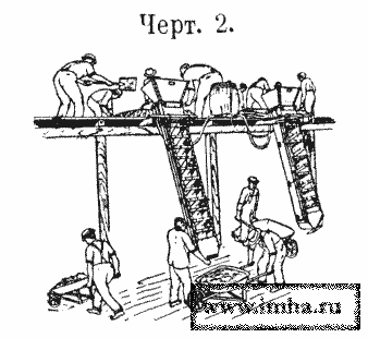 На платформе (черт. № 2) укладывается слоями щебень (гравий), песок и цемент; рабочие лопатами эти материалы бросают в приемную воронку, где они проходят через решетку и, падая, перемешиваются, отражаясь многократно от боковых полок и железных стержней. Вода проводится тонкими струйками внутрь желоба посредством двух поперечных отростков водопроводной трубы, снабженной кранами.