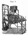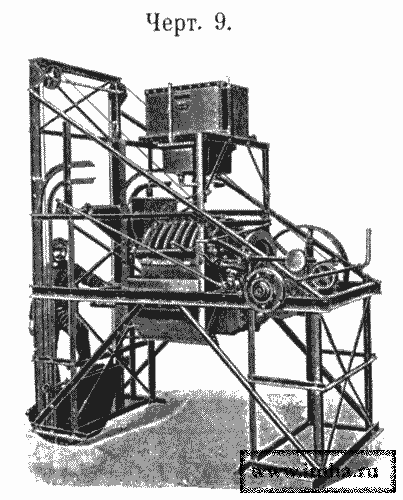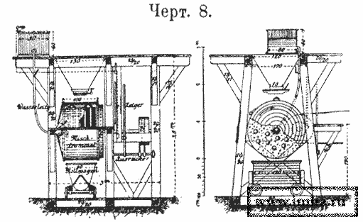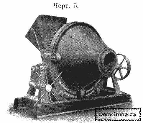 3) Бетоньерки третьей группы содержат внутри барабана 25-50 стальных шаров, весом до 15 фнт. В стенке барабана (черт. №№ 8 и 9) имеется окно, закрывающееся задвижкой, со вставленной в него решеткой, в которой ширина просветов меньше диаметров шаров. Загрузка барабана производится посредством подъемника. При вращении барабана шары разбивают, перемешивают и перетирают смешиваемые материалы.