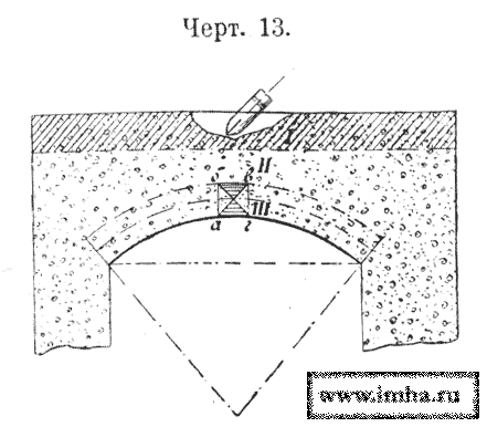 б) производством кладки отдельными массами в виде клиньев во всю толщину свода (черт. № 12).