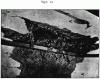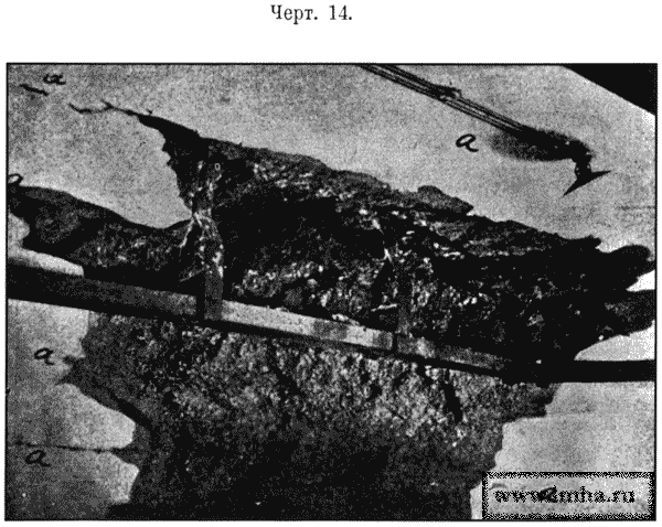 Горизонтальные трещины разделяют всю первоначальную толщу перекрытия на несколько более тонких перекрытий, совершенно не связанных между собою и потому не могущих оказать требуемого сопротивления разрушительному действию снарядов; каждое из них легко может быть разрушено дробящим действием снаряда, вследствие чего расслоившееся Бетонное покрытие легко разбивается по частям. При углублении снаряда в расслоившийся Бетон являются сдвиги больших глыб Бетона; газы, получающиеся при разрыве снаряда, распространяются по трещинам расслоения и срывают отдельные слои его, вследствие чего сравнительно очень легко получается обнажение ядра массива.