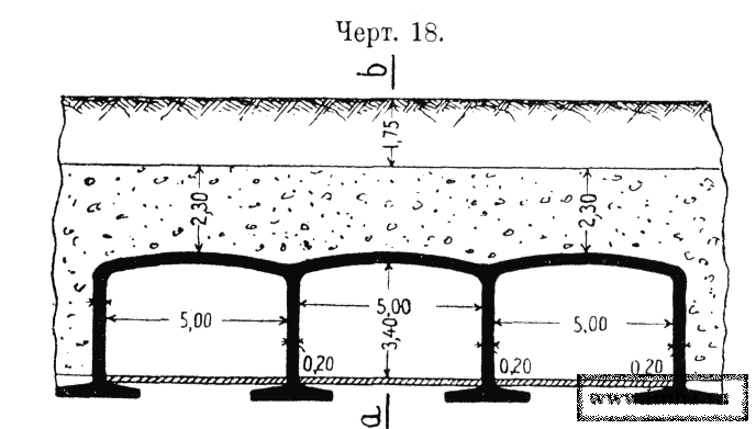 II. При покрытиях сводчатых, взамен железных балок, весь внутренний слой делается из железобетона (черт. № 18), толщиной до 0,20 м, при толщине вышележащего слоя Бетона до 2,30 м.