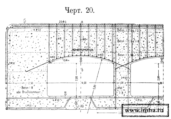 IV. При толщине 2 метра (черт. № 20), сплошной Бетонный свод усилен:
