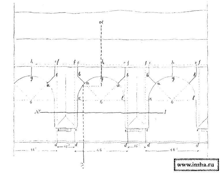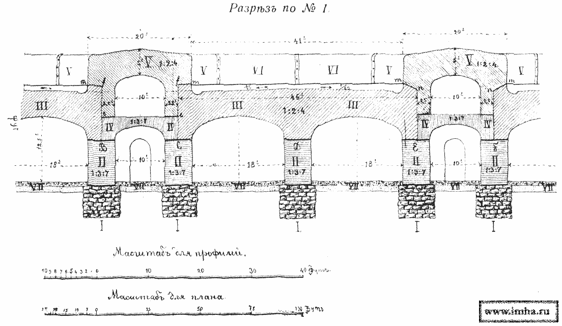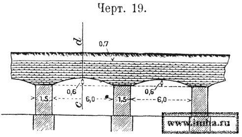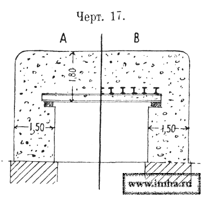 I. Пролеты длинной до 4,5 м перекрываются одним рядом двутавровых железных балок высотою до 35 см., уложенных в расстоянии до 35 см.; в промежутках и поверх балок укладывается Бетон общею толщиною до 1,8 м (черт. № 17, А).