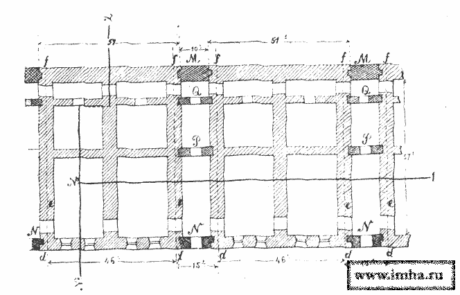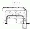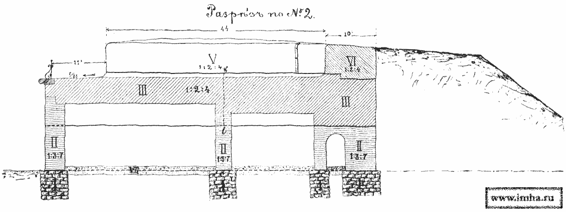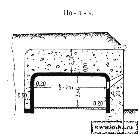 III. При пролетах длиною до 6 м казематы перекрываются железобетонными сводами с подъемом 1/10, толщиною в замке 1,7 м. Вся масса Бетона усилена равномерно железными стержнями диаметром 1 см., уложенными перекрестными рядами на расстоянии 10 см друг от друга (черт. № 19).