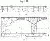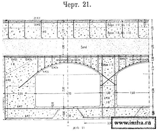 V. При пролетах до 6 м. казематы (черт. № 21)перекрыты железобетонными сводами толщиной в замке 0,37—0,40 м., в пятах— 0,60 м., при подъеме 1/10; свод усилен двумя сетками из продольных и поперечных стержней.