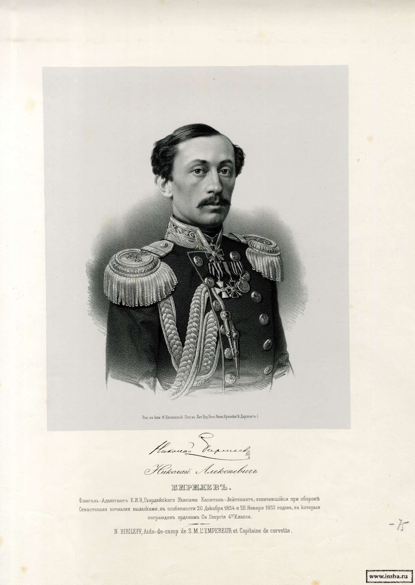 | Пашенный, Ф. Капитан-лейтенант Николай Алексеевич Бирилев. - 1 л.: Литография; 19,5х15,7; 50,4х36 см. |