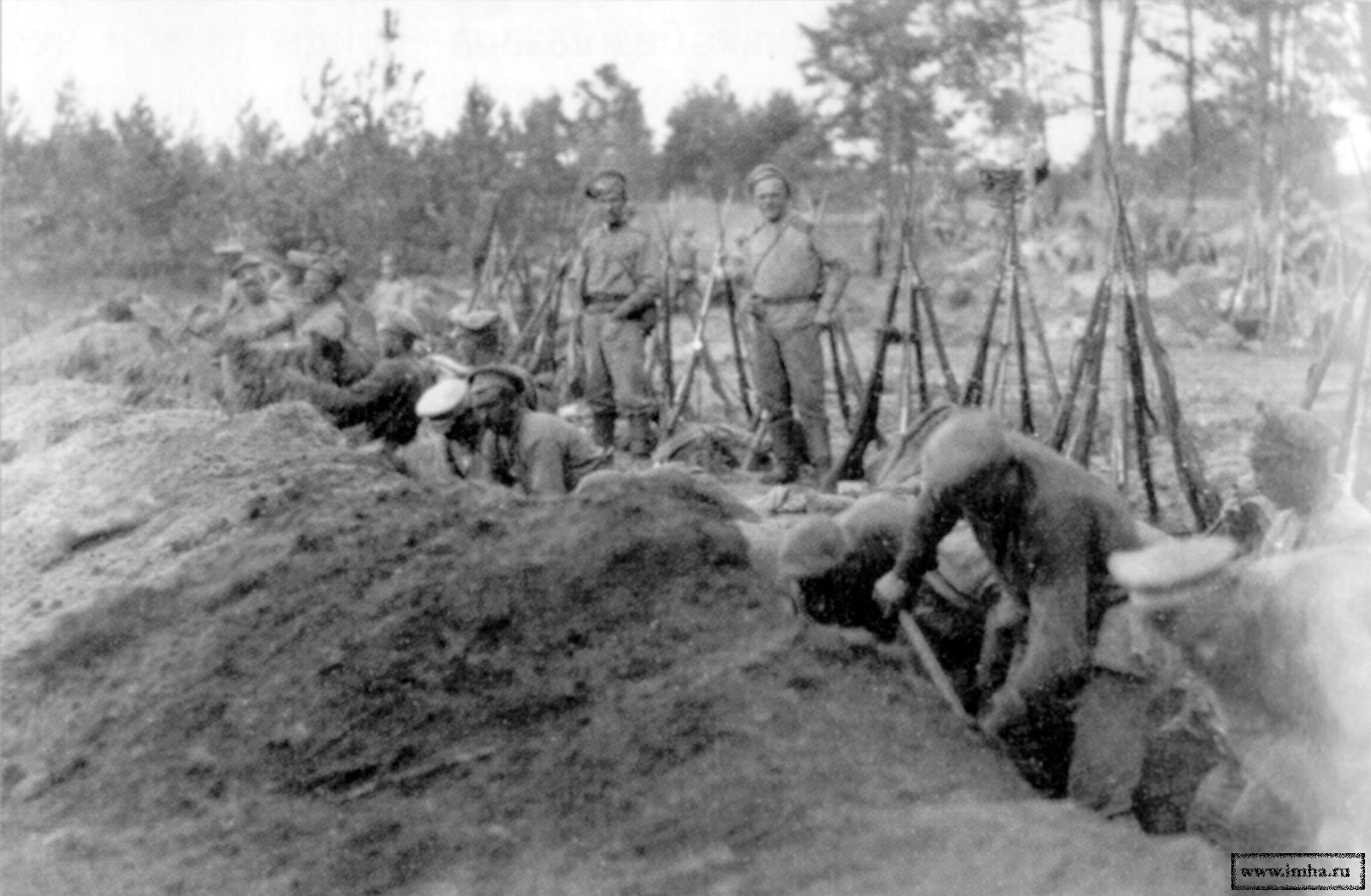| Строительство полевых укреплений на позициях 5-го Сибирского стрелкового полка. Юго-Западный фронт. 1915 г. Фотограф неизвестен. РГАКФД. Ал. 1188 г, сн. 22. |