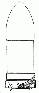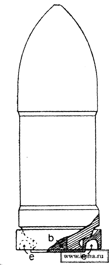 На фиг. 1 представлена 9-дм. граната с привинченной к дну ее медной чашкой с отогнутыми назад краями; под давлением пороховых газов при выстреле края поддона, разгибаясь, раздаются по диаметру и снаряд, врезывается краями поддона в нарезы, при чем прорыв газов почти совершенно устраняется.