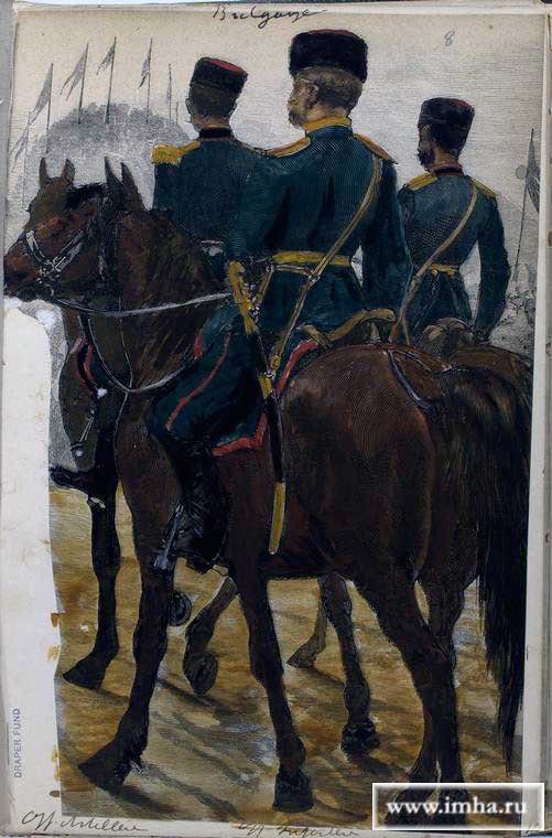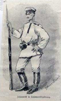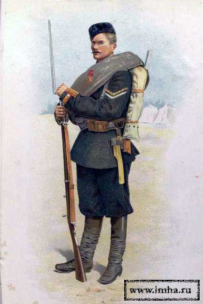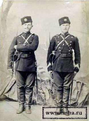 Обмундирование весьма близко напоминает русское; служебная форма—защит. цвета.