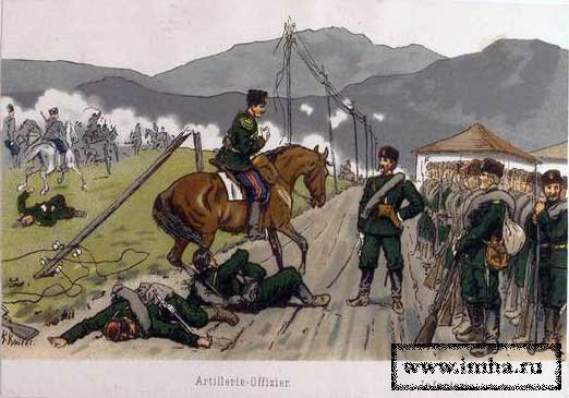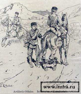 3) полевая и горная артиллерии — пушки и гаубицы скорострельные системы Шнейдера (Крезо) и Круппа. Лафеты со щитами. Дальность 7,5-см. полевой пушки (Шнейдера) — 5 вер. 320 сж., горн. 7,5 см. Круппа — 4 вер. 445 сж. (граната) и 4 вер. 162 сж. (шрапнель), горн. 7,5 см. Шнейдера — 4 вер. 445 сж. (граната) и 4 вер. 375 сж. (шрапнель), 15-см. гаубицы Круппа — 5 вер. 85 сж.