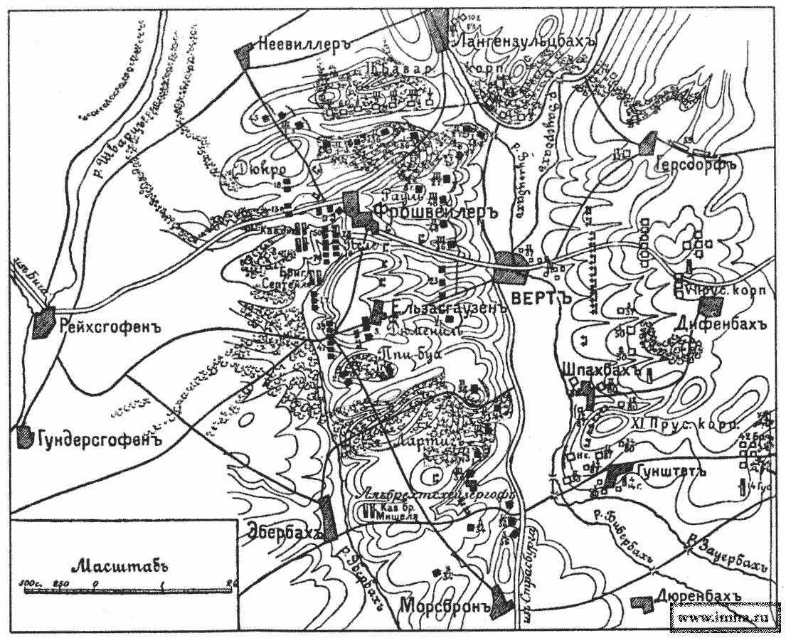 V корпусу Мак-Магон приказал спешить к нему на присоединение, но в, то, же время командиром этого корпуса было получено распоряжение из главной квартиры императора о высылке двух дивизий в Бич. Только 6 августа генерал Фальи мог отчасти выполнить приказание Мак-Магона, выслав в 6 ч. утра дивизию Гюйо-де-Лепара на Нидербронн, Рейхсгофен и около 3 ч. дня дивизия Гоз к Филипсбургу и бригаду Массион с артиллерийским резервом на Лембах. Благодаря этому, на поле сражения под Вертом из частей V корпуса прибыла только дивизия Гюйо-де-Лепара, на долю которой выпало прикрывать отступление французов. После боя 4 августа соприкосновение между обеими сторонами было потеряно. Кронпринц не предполагая близости французов, рассчитывал так же, как и Мак-Магон, дать бой 7 августа. По диспозиции на 5 августа 3-я немецкая армия расположилась: XI корпус – у Зульца и сводный (Вердера) – у Ашбаха, фронтом на Гагенауский лес; V корпус – у Прейшдорфа и II баварский – у Лембаха, фронтом на запад; I баварский – у Ингольсгейма в резерве 4-я кавалерийская дивизия, высланная 5-го на разведку по направлению к Гагенау и Рейхсгофен, открыла неприятеля в двух направлениях – у Верта и Гагенау, но соприкосновения с ним не поддерживала, вследствие чего не было достаточно определенно выяснено положение французских войск. Донесения V корпуса из Прейшдорфа и II баварскаго из Лембаха также указывали на расположение французов за р. Зауербах. Вследствие этого на 6 августа XI корпусу приказано перейти к Хольшлоху и занять Сурбург и Гагенаускую дорогу, I баварскому – к Лобзанну и Лампертслоху, сводному – к Реймерсвейлеру, выдвинув аванпосты к Гагенаускому лесу. II баварскому корпусу в особой инструкции было указано на необходимость удержать французов от отступления на главные силы (к Меду) и, в случае канонады у Верта, 6-го утром, атаковать их левый фланг одной дивизией (в Ланхензульцбах). Французские войска (около 35 т. ч.) были расположены вдоль ручья Зауербах, на протяжении около 7 верст. Позиция командовала над противоположным берегом ручья. Селения Фрошвейлер и Ельзасгаузен, леса Итибуа и Нидервальд и ферма Альбрехтсхейзергоф представляли ряд опорных пунктов, местность между ними была весьма пересеченная. Крутые скаты, обращенные к р. Зауер, покрытые виноградниками и хмельниками, плохо обстреливались с позиции. Ощущался недостаток в хороших артиллерийских позициях. Ручей Зауер, разлившийся от дождей и почти везде непроходимый в брод, прикрывал фронт позиции; впрочем, мосты на нем не были разрушены.