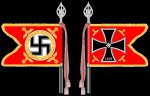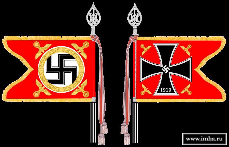 Знамя артиллерийского батальона (дивизиона) эсэсовского полка личной охраны Адольфа Гитлера ("Лейбштандарта СС Адольфа Гитлера") отличалось от знамени его пехотного батальона меньшими размерами. Оно представляло собой прямоугольное полотнище красного цвета с двумя косицами и с золотой бахромой по краям. На аверсе знамени был изображен общегерманский Железный крест 1939 года в центре и четыре золотых орла "вермахтовского образца" (с распростертыми крыльями) по углам полотнища. На реверсе знамени был изображен черный, обведенный черным контуром прямостоящий крюковидный крест-коловрат (значительно большего размера, чем изображенный на обычных штандартах пеших полков СС), вписанный в белый круг, обрамленный круглым венком из золотых дубовых листьев, с четырьмя золотыми орлами "вермахтовского" образца на вписанных в золотые дубовые венки коловратах по углам полотнища. Черное, с двумя серебряными кольцами (выше и ниже полотнища) древко знамени было увенчано серебряным ажурным навершием в форме плоского наконечника копья с монограммой "LAH" (Leibstandarte Adolf Hitler), аналогичной шифровке на погонах чинов "Лейбштандарта", и украшено двумя черно-бело-красными лентами с серебряными кистями на концах.
