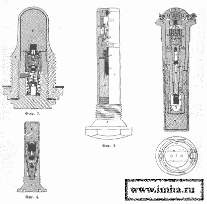 Русский донный Взрыватель к 9 и 11-дм. пироксилиновым бомбам (фиг. 1), собран в донном винте 1, ввинченном в запальный стакан 2. Внутри винта собрана удлинительная трубка 3, поверх которой ввинчена порох, петарда а и большой капсюль 4. Детонатор 5 помещен в футляре, надетом на донный винт.