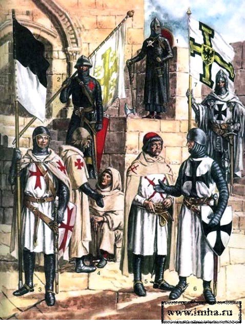 На иллюстрации изображены защитники Акры - главным образом, члены некоторых военно-монашеских орденов, учрежденных в Святой Земле и участвовавших в ее обороне от сарацин вплоть до падения Аккона: