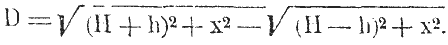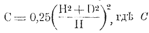 , где W – работа в клг.мтр., необходимая для разрушения двойного днища современного судна = 33 клг.мтр.; А – коэффициент взрывчатого вещества, для пироксилина = 2,04; С – заряд в кг; R – расстояние в м; D – коэффициент, характеризующий положение точки M относительно заряда и зависящий от углубления заряда Н, углубления поражаемой точки h и горизонтального расстояния между ними – х и равный:
