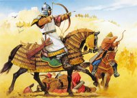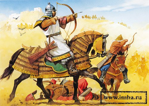 Превосходно обученные, выросшие в седле татаро-монгольские всадники, вселявшие страх во все народы средневековой Азии и Европы, на своих маленьких, мохнатых лошадках, под белым "девятибунчужным" (то есть украшенным, по мнению одних исследователей, девятью черными хвостами яков, а по мнению других - например, Ю.Н. Рериха - девятью белыми конскими хвостами) знаменем Чингисхана, побеждали народ за народом, страну за страной. Наряду с тяжелой конницей, вооруженной длинными пиками и короткими мечами, основную ударную силу татаро-монгольской армии составляли конные лучники, чья меткость наводила ужас на врагов и не раз решала в пользу монголов исход решающих сражений.