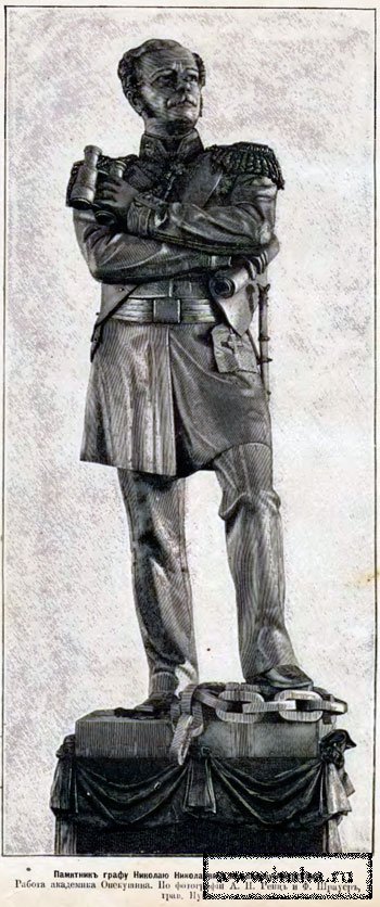 Высота статуи 1/3 всего памятника. Отлита она Гавриловым и весит 240 пудов. Статуя будет отправлена чрез Одессу и Владивосток в Хабаровск, где ее поставили на высокой скале, отвесно спускавшейся к Амуру.