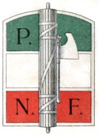 /2/ Итальянское слово "фашист» (fascista) происходит от древнеримских фасций (лат.: fasces, итал.: fasci) - атрибутов военных и гражданских должностных лиц, представлявших собой пучки (связки) прутьев (розог) со вставленным в них топором, перевязанные лентами или ремнями. В древней Римской республике (а впоследствии - в пришедшей на смену республике Римской империи) фасции (фасцы, фаски) были символом права должностных лиц приговаривать виновных к телесным наказаниям и смертной казни. Поскольку телохранители, носившие фасции за римскими царями и чиновниками-магистратами, именовались по-латыни ликторами (лат.: lictores, итал.: littori), фасция имела и еще одно название - "литторио» (итал.: littorio). Название "Литторио» носили два отборных формирования дивизий итальянской армии - добровольческая пехотная дивизия, сражавшаяся против красных в годы Испанской гражданской войны (1936-1939), и 133-я танковая дивизия, сражавшаяся против британцев в составе Африканского корпуса Роммеля (1941-1942). Вождь (дуче) итальянских фашистов Бенито Муссолини придал эмблеме фасций (фаши) дополнительное значение символа объединения всех итальянских патриотов, назвав отряды своих сторонников "боевыми связками», т.е. "боевыми соединениями» ("фаши ди комбаттименто», итал.: fasci di combattimento). Местные партийные организации фашистов также именовались "фаши» (ед. число: "фашио» или "фашо», итал.: Fascio). Партийный значок фашистов Мусолини представлял собой металлический жетон, окрашенный в цвета трехполосного государственного флага Италии ("триколора», итал.: tricolor) - зеленый, белый и красный (но с полосами, расположенными горизонтально, а не вертикально, как на флаге) - с наложенной на него вертикальной серебряной фасцией и черными заглавными латинскими литерами "P.» (Partito) на верхней зеленой, а также "N.» (Nazionale) и "F.» (Fascista) - на нижней красной полосе. Партийный флаг итальянских фашистов представлял собой прямоугольное полотнище черного цвета с вертикальной золотой фасцией, перевязанной серебряными ремнями и серебряным лезвием вставленного в фасцию топора.