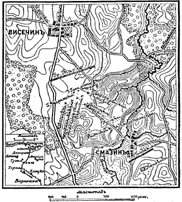 Загряжский, хотя и успел захватить Свеч и бывшее там запасы, но не мог отрезать поляков от Тухеля. Тарло, вступив в переговоры с Загряжским, воспользовался этим и быстро проследовал на Кониц к Путцигу, где предполагал соединиться с французским десантным отрядом. Миних, узнав об опасности, угрожавшей его тылу, выслал Ласси против Тарло, приказав Загряжскому с ним соединиться. 6 апреля Ласси с 3 т. драгун настиг 8-тыс. отряд Тарло, главным образом конного, занимавшего выгодную позицию на равнине у Висечина, имея авангард у д. Смазина. Казаки быстро очистили д. Смазин; 7 драгунских полков был оставлены в конном строю, а 2 полка спешились, укрыв коноводов в овраг.