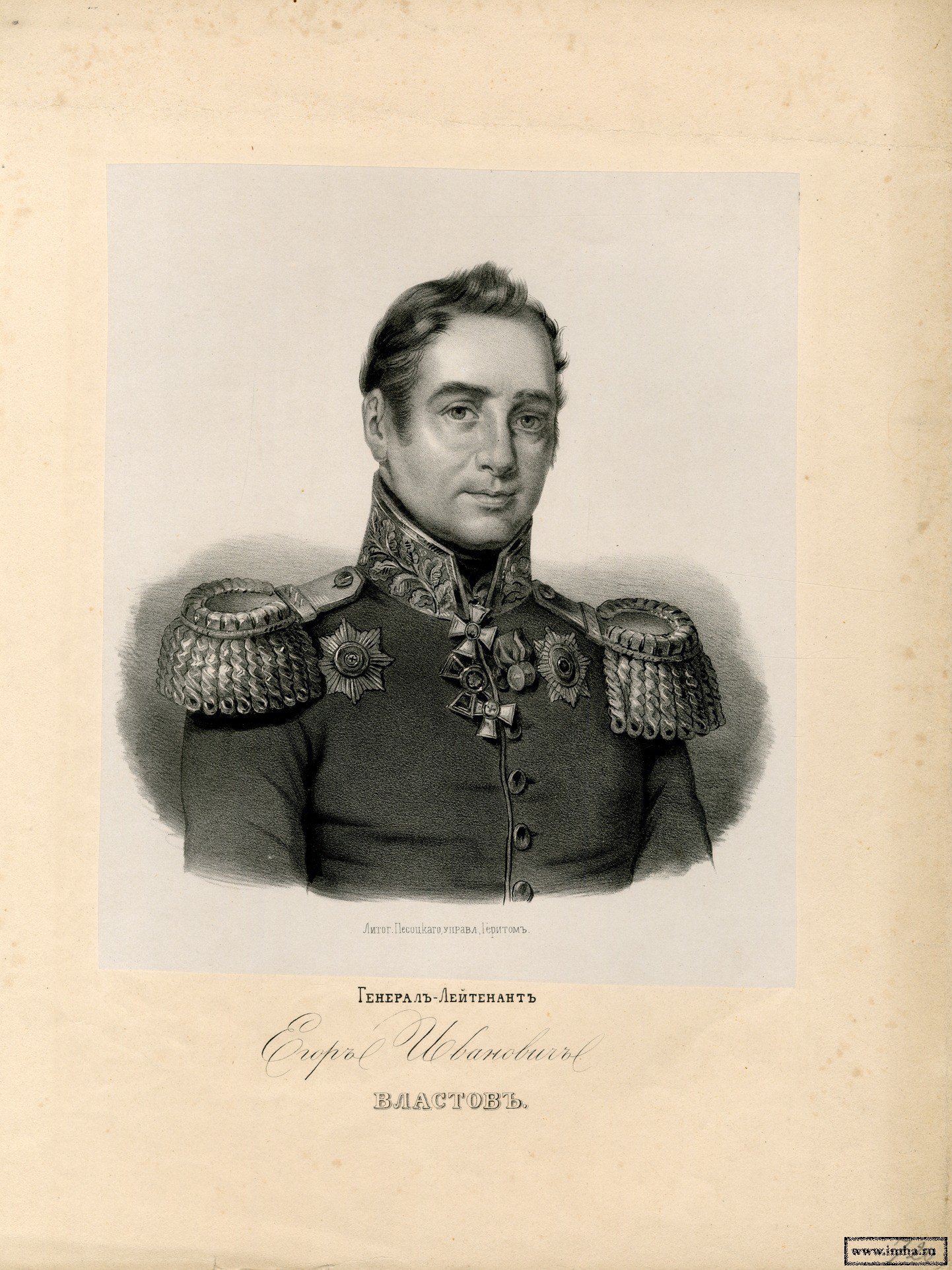 | Генерал-лейтенант Егор Иванович Властов. - 1845. - 185х190; 372х290 мм: Литография с оригинала из мастерской Д. Доу. |