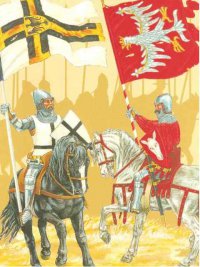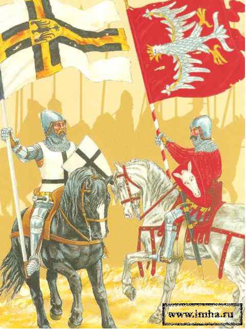 Не следует также забывать о многочисленном контингенте "прусских рыцарей» - светских вассалов Тевтонского ордена, являвшихся потомками окрещенных и со временем ассимилировавшихся знатных пруссов ("великих свободных»), наделенных орденом земельными угодьями и обязанных за это являться в случае войны по призыву Магистра "людно, конно и оружно». Орденская пехота также состояла в основном из сельского ополчения "малых свободных» пруссов, сражавшихся в пешем строю, а также из контингентов епископов орденских владений и из отрядов, присланных купцами и бюргерами городов, расположенных на территории прусского орденского государства. Из числа последних славой особо искусных бойцов пользовались данцигские моряки, не знавшие себе равных в искусстве владения боевым топором.