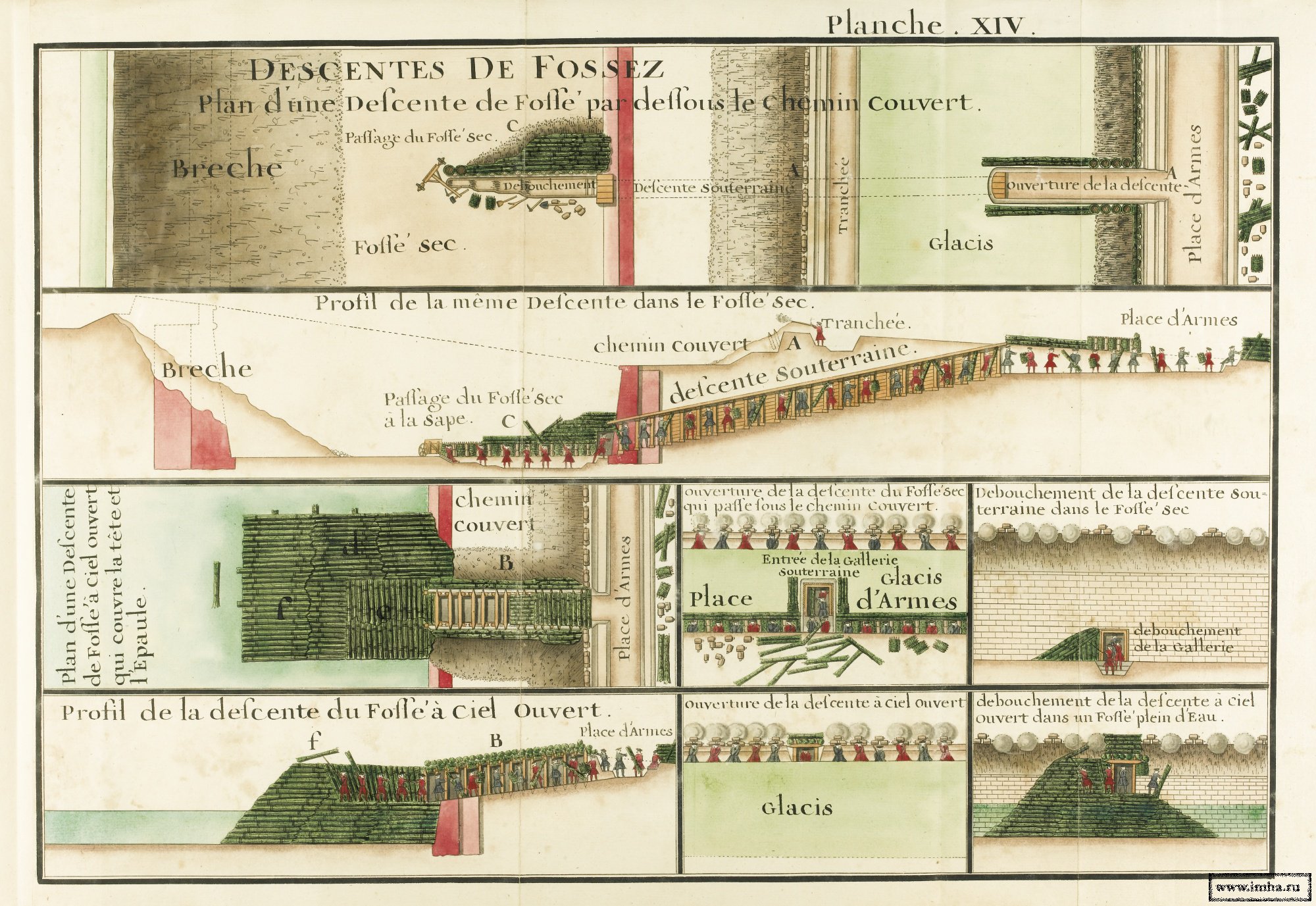 Видя в устройстве подступов лучшее средство, уменьшить потери в людях, ВОБАН сознавал необходимость крепко поддерживать головы этих работ и для этого впервые предложил располагать параллели и систематизировал постепенное приближение ими до венчания гласиса. (Подробности см. История фортификации).