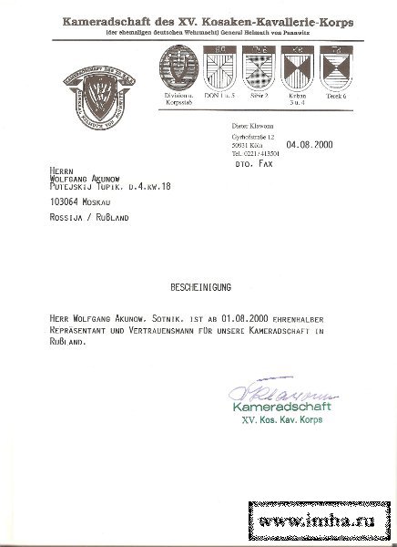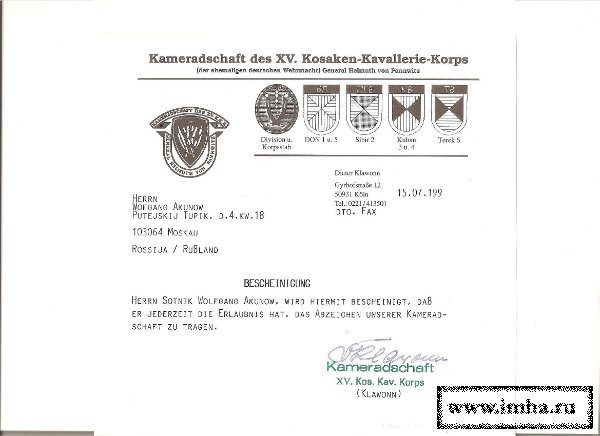 | Удостоверение Товарищества XV Казачьего кавалерийского Корпуса | |