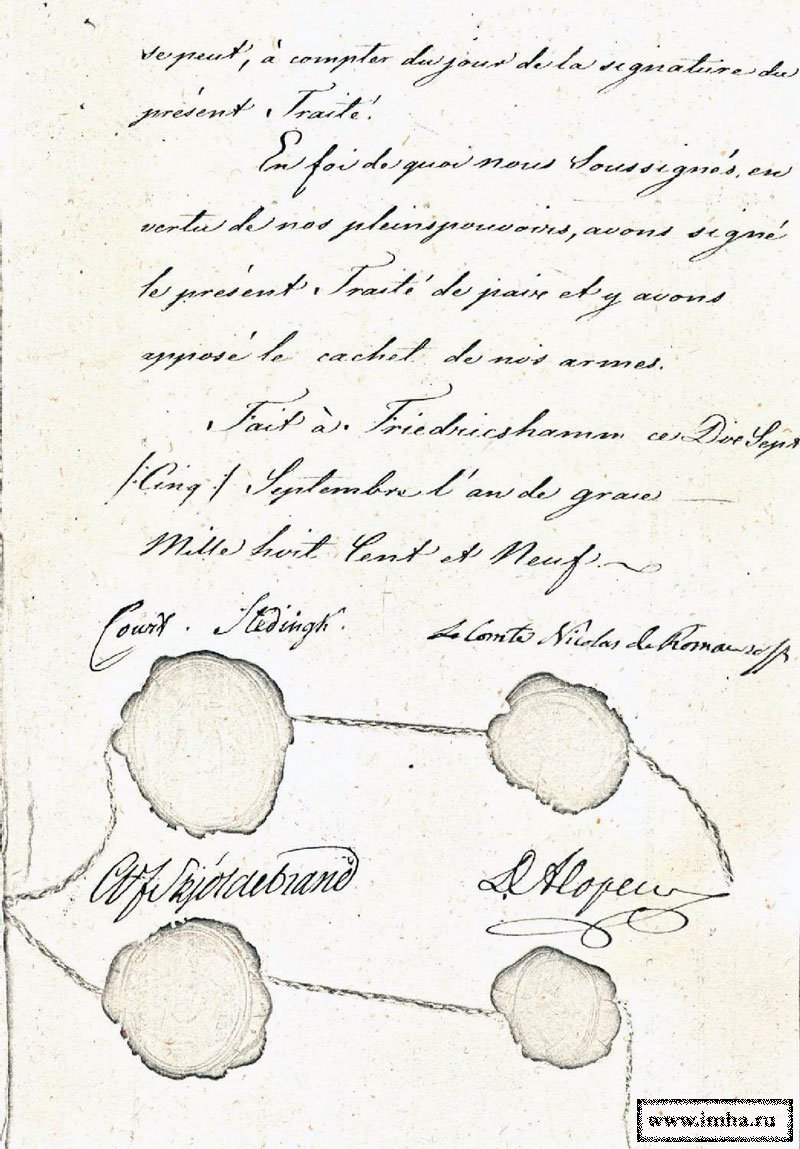 Появление гр. Каменского в Вестроботнии ускорило ход начатых в Фридрихсгаме 4 августа мирных переговоров. 5 сентября подписан мирный трактат, подписанный послом Curt von Stedingk, генерал-майором A-F Sk?ldebrand, G. Acerbin, гр. Румянцовым.