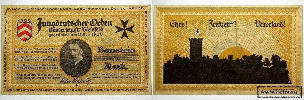 "Младотевтонский (Младонемецкий) орден» ("Юнгдойчер орден», сокращенно "Юнгдо») (*см. фото в заголовке настоящей военно-исторической миниатюры) возник на основе добровольческого корпуса под названием "Кассельская офицерская рота», переняв его эмблему – черный восьмиугольный мальтийский крест (отличавшийся по форме от прямого или уширенного черного креста "старого», основанного в раннем Средневековье, Тевтонского, или немецкого, духовно-рыцарского ордена, о котором будет подробнее сказано ниже), помещенный на белые знамена и белые щитовидные нагрудные знаки марауновцев. В русскоязычной литературе организация, учрежденная Марауном, часто неправильно именуется "Младогерманским орденом» - подобно тому, как Немецкий (Тевтонский) рыцарский орден порой неправильно именуется "Германским рыцарским орденом». Артур Мараун сознательно создал свой "младотевтонский» орден в подражание упомянутому выше "старому» рыцарскому Тевтонскому (Немецкому) ордену (к описываемому времени возвращенному революцией в Австрии в свое первоначальное состояние госпитальерского католического монашеского братства), став его "Верховным Магистром» (Гохмейстером, или, правильнее: Гохмайстером), имевшим в своем подчинении собственных "комтуров» (командоров) и "братьев-рыцарей» (а также "орденских сестер»).