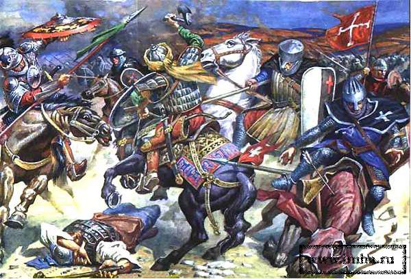 "Мелек (король - В.А.) франков, стоявший на холме с дружиной своих рыцарей, совершил блестящее нападение на противостоявших ему мусульман и погнал их туда, где находился мой отец. Я следил за отцом и видел, что он был сильно озабочен. Мусульмане вновь вступили в бой и загнали христиан обратно на холм.