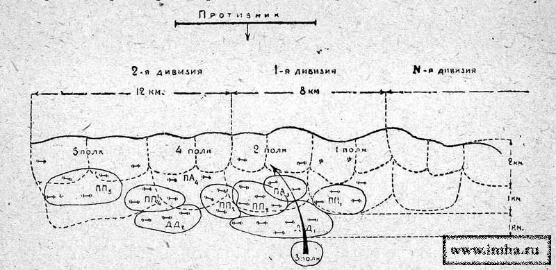 Решение этих многообразных и технически трудновыполнимых задач потребует расположения орудий полковой артиллерии или совместно на одной огневой позиции, или по-орудийно как на закрытых, так и на открытых, но тщательно маскированных огневых позициях. Нормальное расположение батарей Полковая артиллерия будет в районе батальонов первого эшелона обороны.