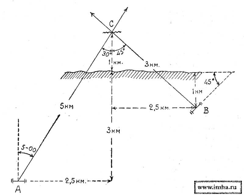 Практически при выборе артиллерийских позиций для возможности обеспечения ближнего косоприцельного огня (в пределах от 2 км и ближе) потребуется установка специальных батарей с направлением фронта их позиций под углом в среднем около 45° к направлению переднего края оборонительной полосы (черт.5). Обстрел этих же целей естественно может быть возложен на ба-тареи, стоящие в большем удалении за передним краем оборонительной полосы, но получить в этом случае косоприцельный огонь под большими углами не удастся. Например, как видно из черт. 5, батарея Л, стоящая на расстоянии 3 км от переднего края оборонительной полосы, будет обстреливать цель С, находящуюся от того же края в 1 км, под углом 30°, причем дистанция до цели будет доходить до 5 км. Несомненно выгоднее было бы ту же цель обстреливать из батареи В под углом в 45° к ее фронту и на расстоянии только 3 км. Как видно из чертежа, обе батареи от направления наступления цели (по перпендикуляру к переднему краю оборонительной полосы) находятся в одинаковом удалении (2,5 км).
