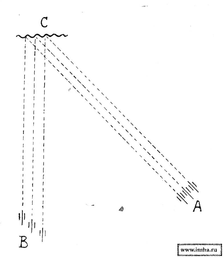 Фронтальный огонь по отношению к фронту стреляющей батареи не всегда будет совпадать с направлением плоскости стрельбы этой батареи, перпендикулярной к фронту, занимаемому целью; например, фронтальный огонь батареи А по отношению цели С (черт. 2) не будет фронтальным, а косоприцельным, в то время как не фронтальный (боковой) огонь батареи В по отношению той же цели С будет для нее фронтальным.