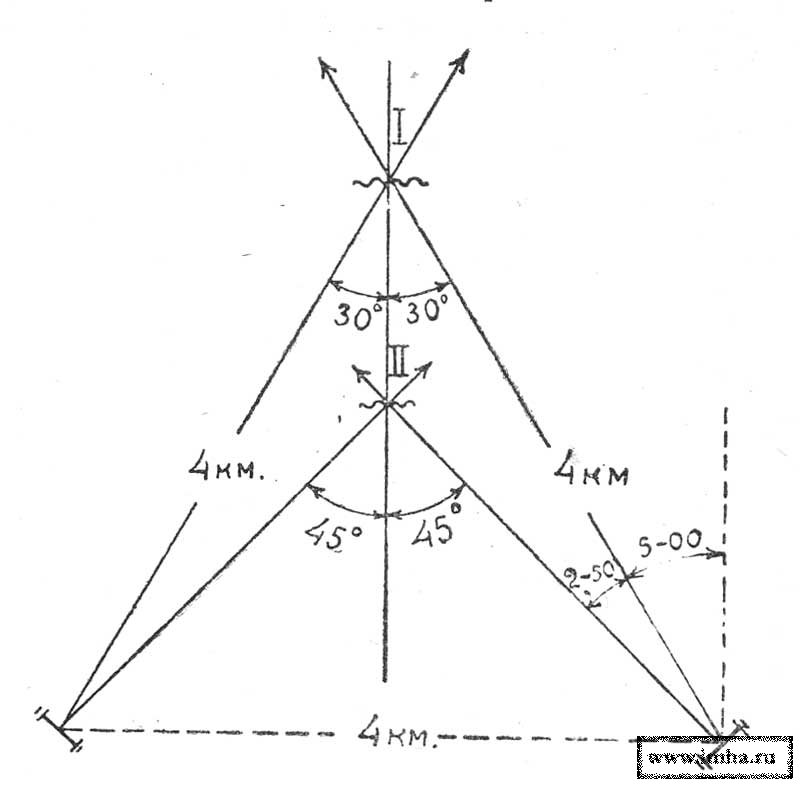 Из черт. 4 видно, что при расстоянии по фронту одной батареи от другой на 4 км обстрел цели I, находящейся на дистанции около 4 км, будет производиться перекрестным огнем под углом в 30°. Приближение той же цели на половинное расстояние в положении II уже позволит обстреливать эту цель под углом 45°, между тем как боковой перенос огня от первоначального направления (на цель в положении I) будет всего в пределах угла 2—50 делениях угломера (“тысячные”). Общий перенос огня от фронтального направления его будет в пределах 45° (7-50 делений угломера), т. е. еще не будет выходить из пределов требования давать с занимаемой батареей позиции огонь по 45° в обе стороны от основного направления фронта батареи. Из этого же чертежа видно, что при дальнейшем приближении цели для ее обстрела потребуется изменение направления огня в пределах больших, чем 45°, что вызовет необходимость для батареи иметь другую позицию или обстрел данной цели вести из других батарей.