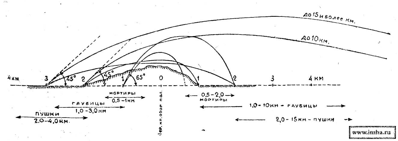 Схема на черт. 6 дает представление о районах артиллерийских огневых позиций, наиболее выгодных и практически наиболее часто применяемых. Как видно из схемы, мортиры располагаются от 0,5 до 1 км от переднего края оборонительной полосы, гаубицы от 1 до 3 км и пушки от 2 до 4 км. Эти полосы одинаково подходяще для легких и тяжелых типов войсковой артиллерии и калибров АРГК. Такое расположение батарей в большинстве случаев дает возможность обстрела фронтальным огнем полосы впереди переднего края обороны для мортир от 0,5 до 2 км, для гаубиц от 1 км и для пушек от 2 км и далее до пределов досягаемости каждой системы орудий.