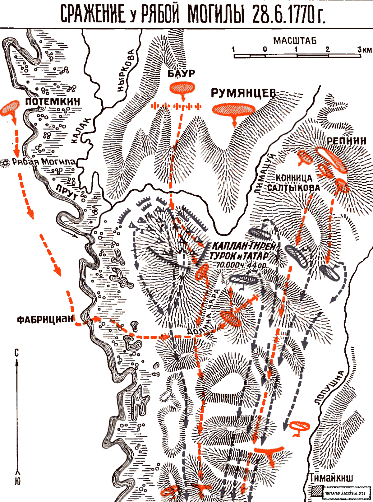 Баур был направлен с фронта, на ретраншмент (см.); Репнин – в правый фланг, чтобы зайти в тыл и отрезать отступление; главные силы поддержали Баура и произвели главную атаку на правый фланг; отряд Потемкина двинулся по правому берегу Прута и в 6 вер. южнее Рябой могилы переправился на левый берег, для атаки в тыл.