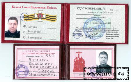 Спешу успокоить маститого белорусского историка (а заодно и тех читателей его книги, у которых могли возникнуть аналогичные подозрения). "Вольфганг Акунов" - отнюдь не литературный "немецкий псевдоним", выбранный мной "далеко не случайно", а мои самые настоящие имя и фамилия, записанные во всех метриках, официальных документах и удостоверениях, в том числе в моей "пурпурной книжице", сиречь, в моем "орласто-коронастом" паспорте гражданина Российской Федерации.