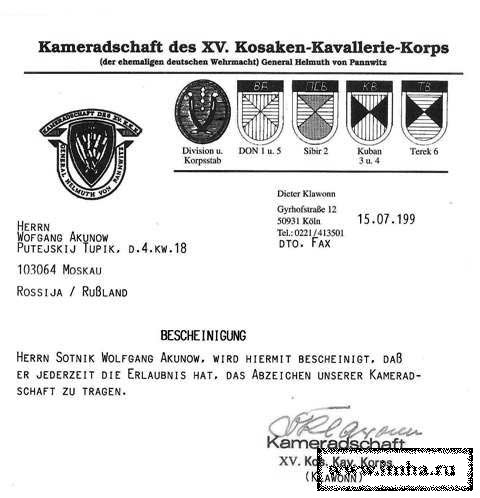 Но нередко эти казачьи части плечом к плечу с подразделениями германского вермахта сражались и на фронте против регулярных частей Красной Армии. Так, в воспоминаниях ветерана белой казачьей борьбы П. Н. Донскова "Дон, Кубань и Терек во Второй мировой войне"/1/, написанных "в память тех, кто пронес казачью доблесть через кровавые застенки ЧЕКА, колючую проволоку советских и немецких концлагерей, кто стал под знамя Второго Казачьего Сполоха и на полях сражений, и в восхождении на Голгофу Лиенца сохранил непреклонную волю к борьбе за казачью вольность", описано участие белых казаков-добровольцев в обороне от Красной Армии области Всевеликого Войска Донского и, в частности, в бою под Батайском в начале февраля 1943 г. , где "белый" казачий отряд остановил танковый рейд красных силами противотанковой артиллерии и конницы (а в том числе – конной казачьей полиции) - правда, при поддержке самолетов германской военной авиации ("Люфтваффе") :