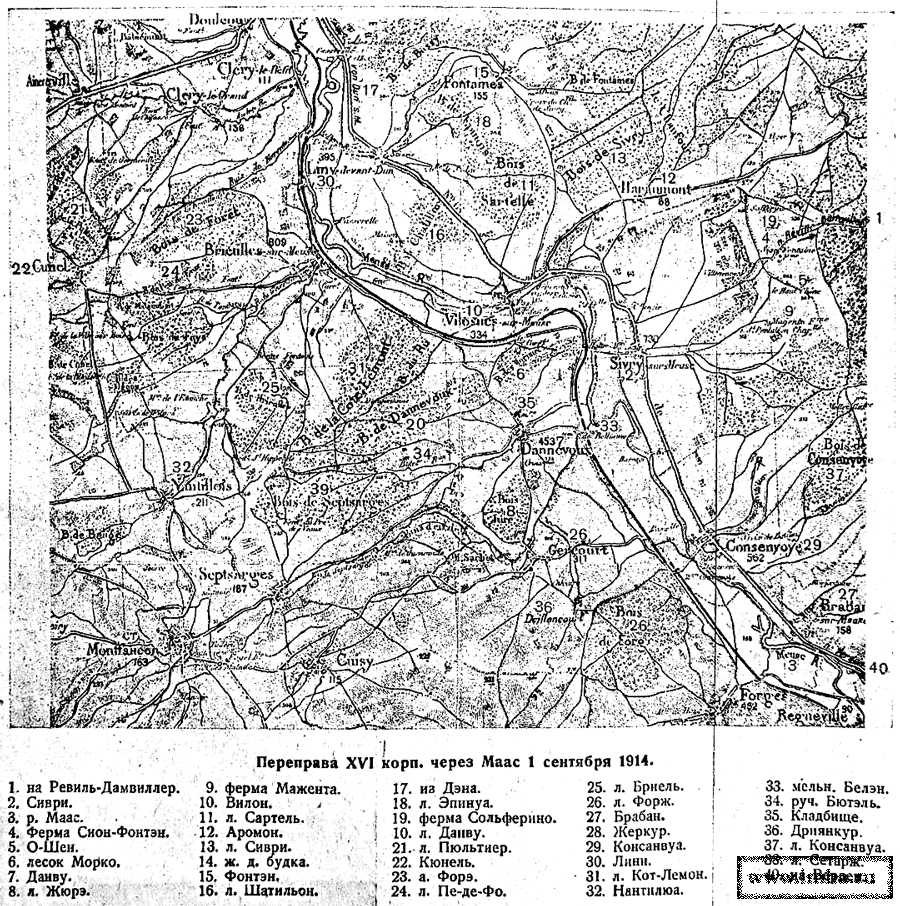 Там в 9 час. утра она получила приказ переправиться через Маас у Сиври. В стратегическом отношении переправа в этом пункте являлась демонстрацией, так как при этом имелось в виду отвлечь внимание противника и его резервы от переправ через Маас, предпринятых ниже по течению. Командир дивизии отдал приказ о занятии войсками исходного положения к востоку от Сиври и о производстве разведки. Так как последняя показала, что левый берег Мааса занят и что все мосты взорваны, то прежде всего возник вопрос об артиллерийской подготовке наступления.