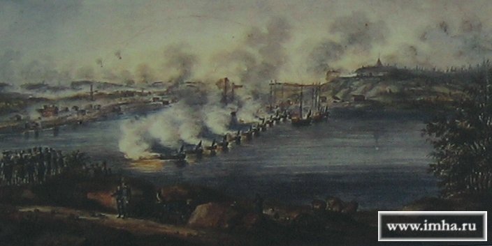 В это же время штабс-капитан Севского полка Шрейбер, с присоединёнными к нему 5 рот. от Сабанеева, перешел (на правом фланге) вброд через реку и рассыпал стрелков влево, к неприятельской позиции, и вправо – в тыл батальонам, действовавшим против Ансельма, а полковника Аргун (по приказанию Каменского) устремился вброд через реку мимо разрушенного моста.