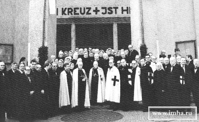 | Верховный магистр (Гохмейстер) Тевтонского Ордена доктор Мариан Тумлер в окружении "рыцарей чести" ("почетных рыцарей", "эренриттеров"), "братьев-священников", "фамилиаров" и "орденских сестер". |