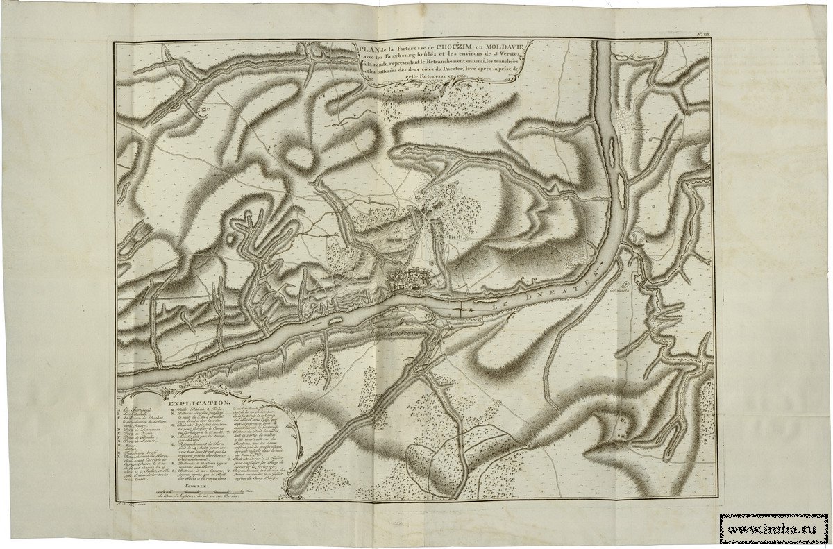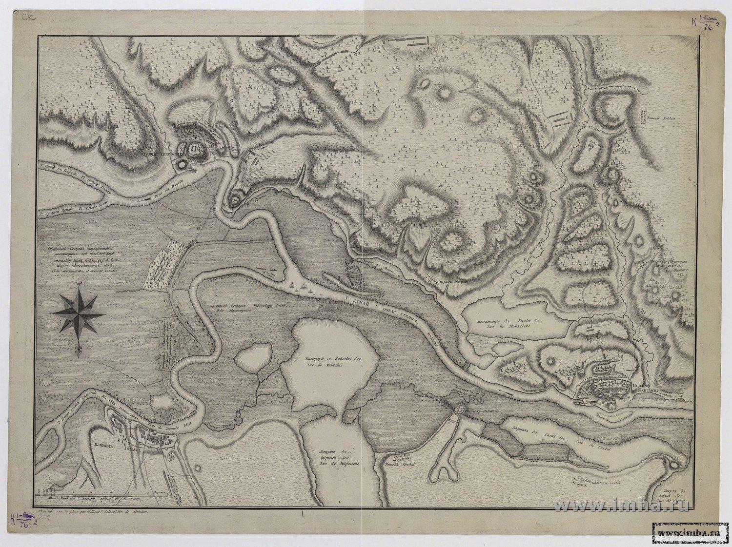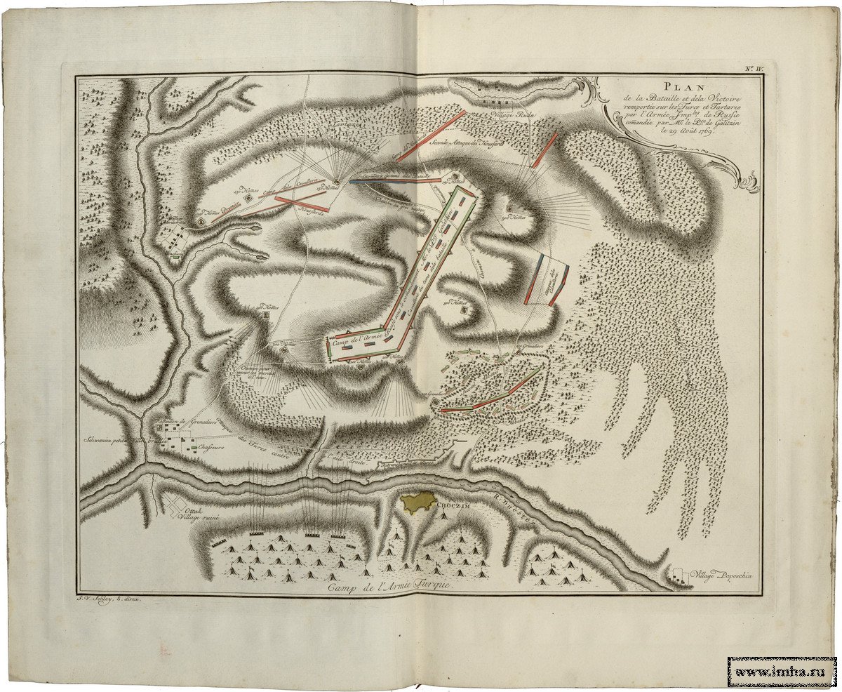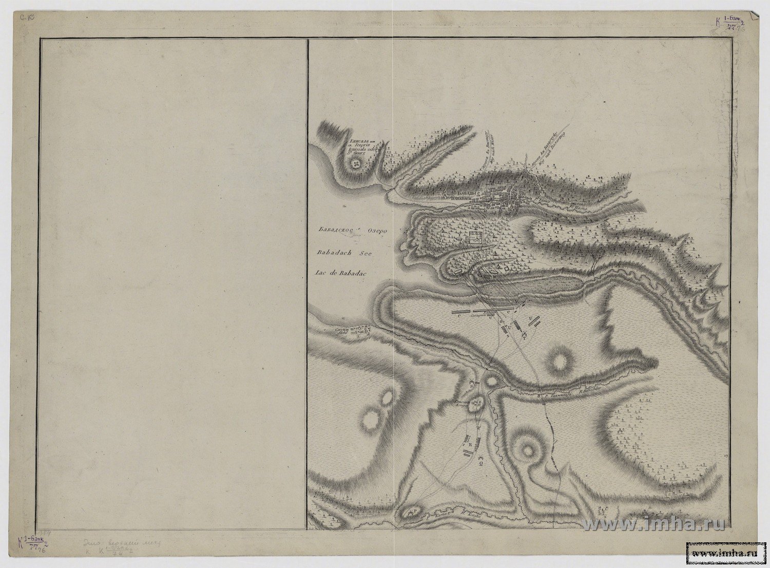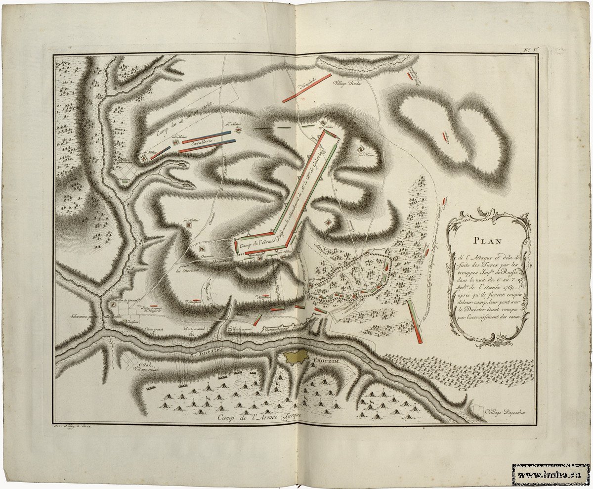 План предпринятый Генерал-Майором Вейсмананом за Дунаем на неприятельские лагери при Сомове, Тулче, Исакче, и на Визирский лагерь при Бабадах, произведенных в действо с 20 по 27 число Октября месяца 1771 года. Dessine sur la place par le Lieut. Colonel Mr de Stricker; [Рисовал Штрикер]. - [Санкт-Петербург]: [Географический департамент АН]: [после 1771]. - 2 л. в общей рамке: Грав. Накл. на синюю бумагу; 44х62 (49х66). - (Серия карт, посвященных сражениям в период русско-турецкой войны 1768-1774 гг.). |