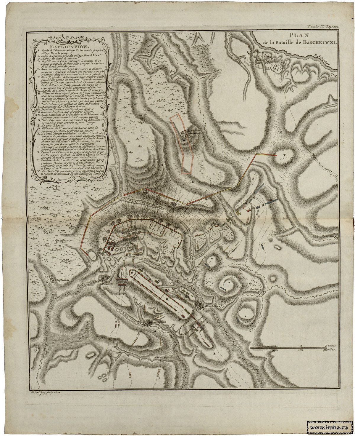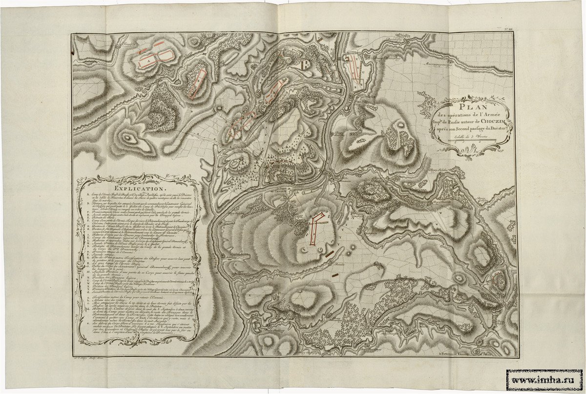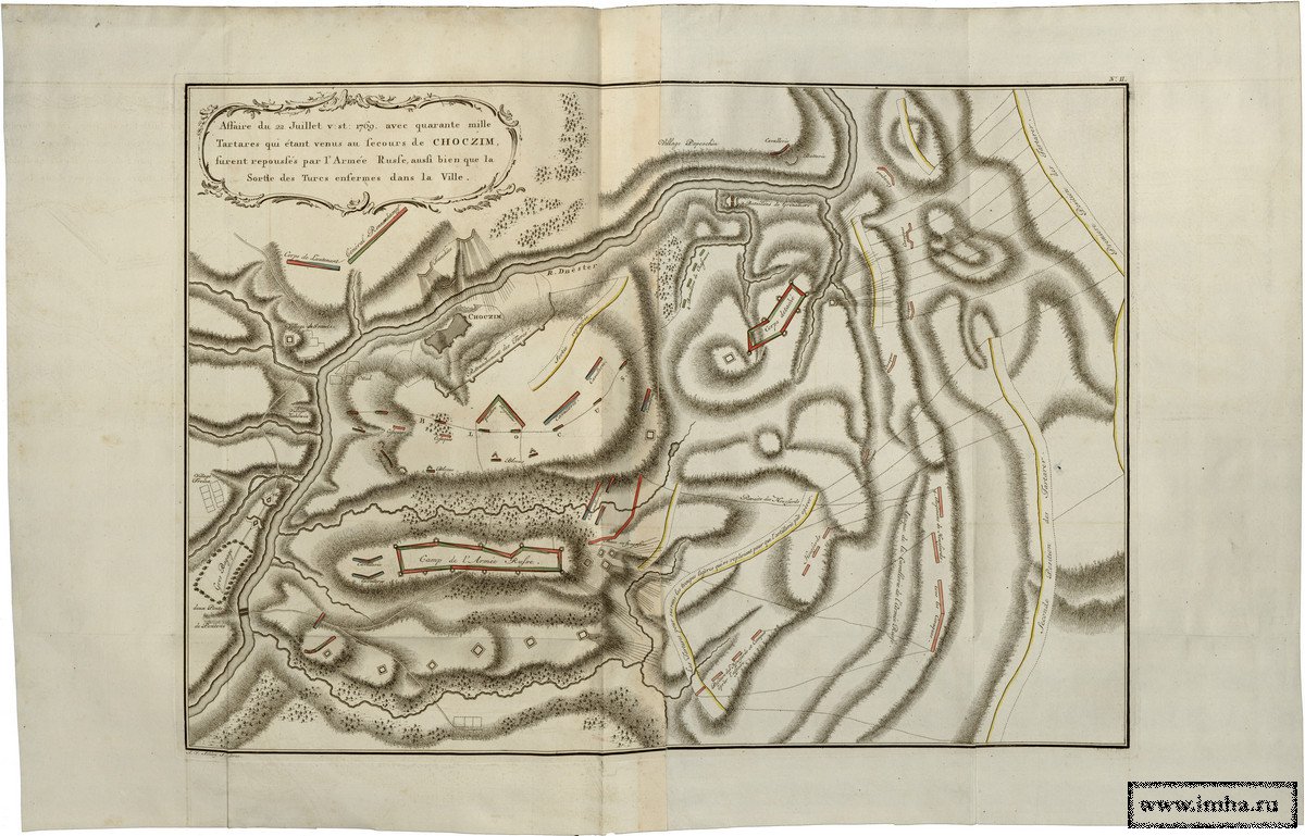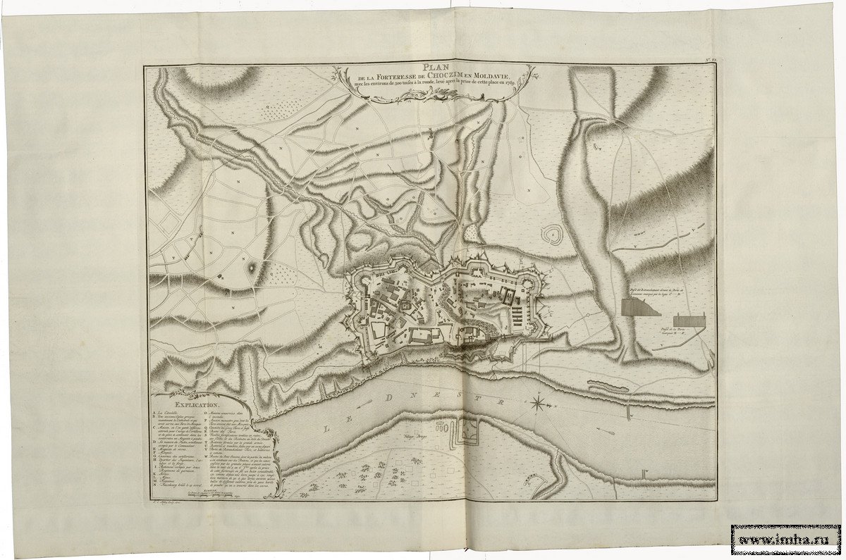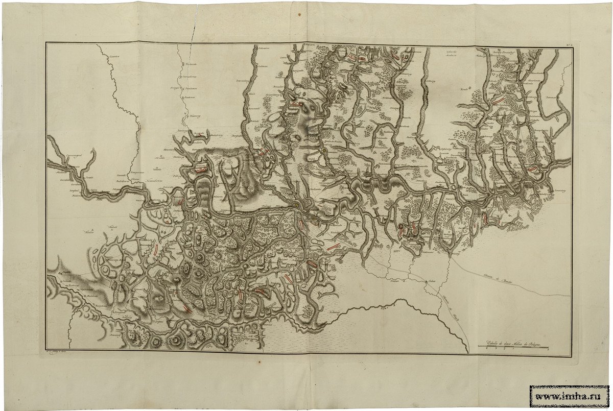 План предпринятый Генерал-Майором Вейсмананом за Дунаем на неприятельские лагери при Сомове, Тулче, Исакче, и на Визирский лагерь при Бабадах, произведенных в действо с 20 по 27 число Октября месяца 1771 года. Dessine sur la place par le Lieut. Colonel Mr de Stricker; [Рисовал Штрикер]. - [Санкт-Петербург]: [Географический департамент АН]: [после 1771]. - 2 л. в общей рамке: Грав. Накл. на синюю бумагу; 44х62 (49х66). - (Серия карт, посвященных сражениям в период русско-турецкой войны 1768-1774 гг.). |