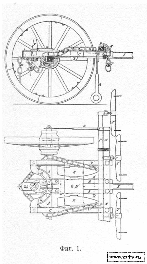 Снизу поперек дышла прикреплена вага К, связанная с концами оси закрутнями L. Сверху дышла привинчен горбыль Н, окованный железною полосой F с отогнутым кверху задним концом G.